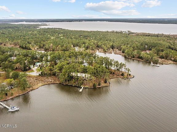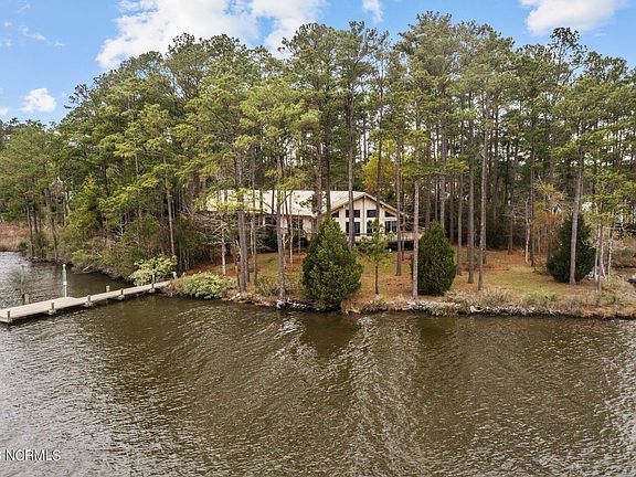 A gracious waterfront residence that perfectly refines the private woodland setting over which it presides: a dramatic water view up, down, and across deep Ball Creek to the expanse of the Bay River beyond! A totally-unique, site specific home that creates an exceedingly rare combination for those seeking the impressive... Imagine a homesite of 1.6+ ACRES w/over 460' OF WATERFRONT highlighting the artistic meanderings of Ball Creek (which offers the potential for deep draft vessels). A concrete pier beckons you to afternoons of fishing & sailing. Tucked into the woods, the large residence was built with exacting specifications to maximize both privacy and magnificent views. You'll appreciate how it harmonizes & naturalizes so beautifully with its surroundings (& how it offers low maintenance with its vinyl shake siding & metal roof)! It offers a graceful, inviting approach onto a large wraparound deck, leading to a formal entrance that ushers you into a spacious, tiled foyer. A most spectacular great room awaits, w/ a soaring 17' vault which enhances the spaciousness & unity with its setting through the numerous windows. The views of the creek are impressive, making this space a hub of happy activity, equally suited to large parties or cozy family gatherings around the fireplace. The living area merges with a huge gourmet kitchen (equipped with extensive counters and cabinets) is ready for the creativity of the sociable cook. To accentuate privacy amidst all the grandeur of space & Nature, the bedroom wing features one bedroom w/waterside deck, and another currently serving as a den. The hallway ends at a master suite w/ bath & deck access. Beyond is a porch designed & screened for a hot tub, with stairs to a storage room +walk-in attic. Another wing is beyond-- A big standalone workshop/loft/office w/full bath! Guest suite? You decide. Zoned geothermal HVAC, 2 wells. A cheerful and comfortable waterfront home which requires a visit to appreciate!