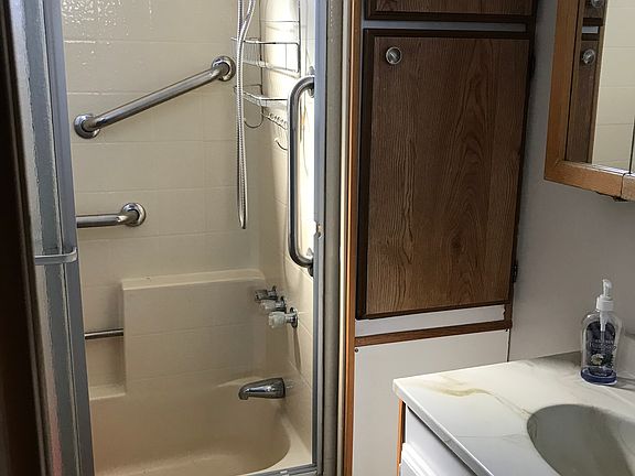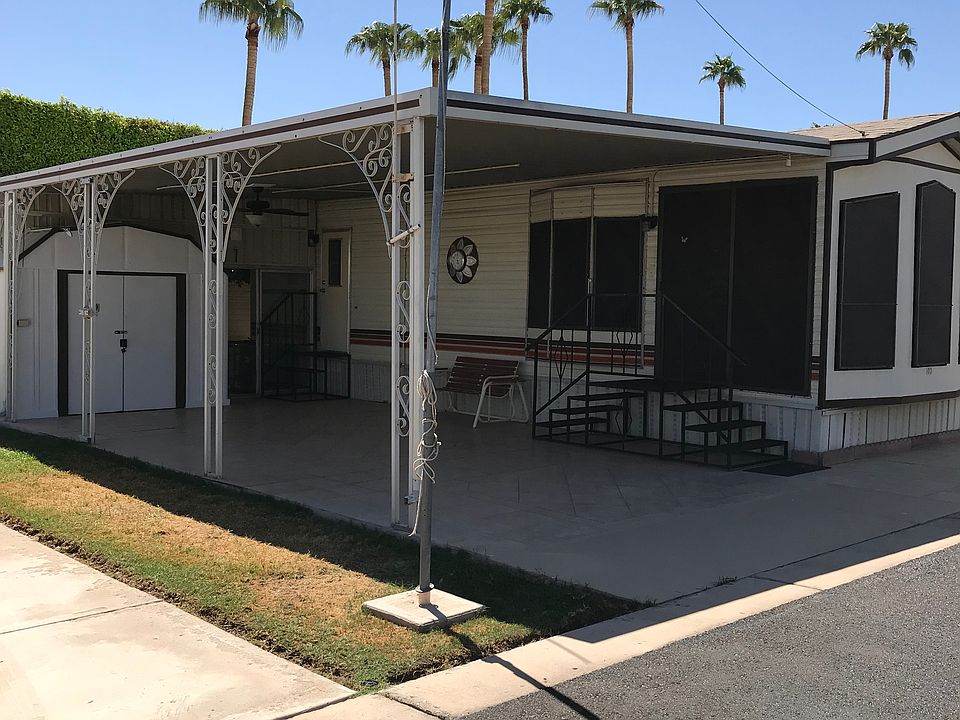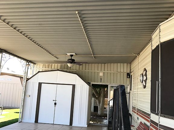 11 x 34 (374 sq ft) taxes $100 per year Co op $1200 per year SS Extra Lg fridge (ice and water in door) with 2 lower drawers for freezer. Dishwasher Soft Water unit Microwave Convection oven Laminate flooring 2 flat screen TV’s (living room and bedroom) 3 ceiling fans (living room and bedroom) also 1 on outside patio with a mister system for those Hot At days. 2 ton A/C unit just serviced BBQ unit, Table and chairs Lots of 110 v outside outlets and overhead lights Shed has shelving, washer and dryer also another fridge. Close to pool, mailboxes and community room Secure gated 55 community in town of Yuma. Orchard Gardens Cooperatives off of Ave B Walking distance to Walmart and New Medical Services just across the street. To view send me a Message. Serious inquires only