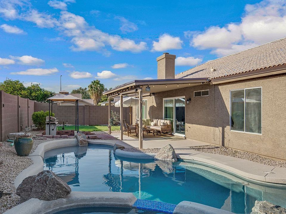 Experience a beautifully remodeled barely lived in single-level residence that masterfully blends modern elegance with timeless charm. Located in the highly sought-after San Marcos Estates, this meticulously maintained home is sure to impress from the moment you enter. Step through the inviting foyer into spacious formal living and dining areas with soaring vaulted ceilings, a cozy fireplace, for released evenings. The split floor plan offers both privacy and functionality, complete with a versatile den perfect for a home office or game space. At the heart of the home is the best ever Kitchen, This kitchen is nothing short of spectacular. Completely reimagined to impress boasting crisp white cabinetry, quartz countertops, a generous peninsula with breakfast bar, walk-in pantry, and brand-new stainless-steel appliances ideal for everyday living and entertaining. "Enjoy the benefits of a whole-home water softener and a premium filtered water system, providing you with cleaner, softer water throughout the house." Retreat to the expansive primary suite featuring a remodeled spa-like bathroom with dual vanities, a stunning walk-in shower, and a massive walk-in closet. Step outside to your own resort-style backyard oasis complete with a sparkling pool, lush real grass, mature landscaping, and an extended covered patio perfect for gatherings or relaxing in the shade. Located just minutes from , vibrant downtown Chandler, upscale dining, shopping, and entertainment. Plus, enjoy quick freeway access to the 101, 202, and US-60 making commuting a breeze. This exceptional home truly has it all don't miss your chance to make it yours. Schedule your private showing today! Pool/yard/Pest control/filters and softener pellets with the added fee of only $300 Total amount $3595 Under market value