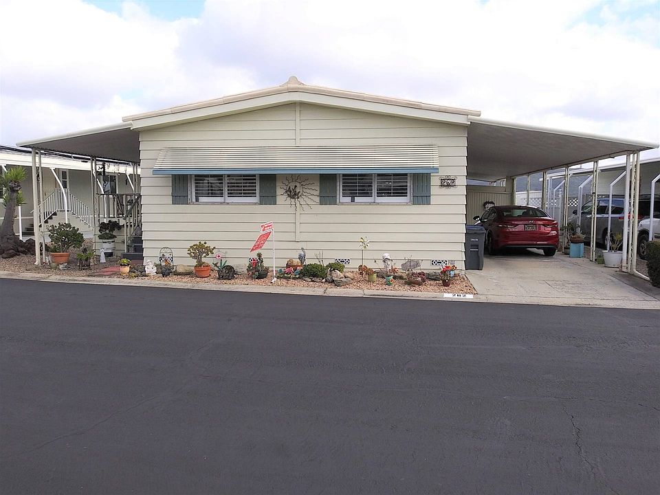 Best Location!!! You will love the location of this 2 bedroom/2 bath home in San Marcos! It sits at the top of the park and affords beautiful views of the mountains in the distance! Nicely upgraded including hardwood-style flooring, window shutters, a wet bar, mirrored wardrobes, built-in hutch, and more! Relax in your fully finished California room! Plus, the yard is huge! Protect your vehicles under the private carport. Two storage buildings convey so there is plenty of storage room. This 5 Star Luxurious Adult community has a huge clubhouse and sparkling, heated pool surrounded by palm trees and bright flowers! Super, super low, controlled rent. Move-in ready. Pets OK. Hurry! Won't last. Call today! Serial S638X/U