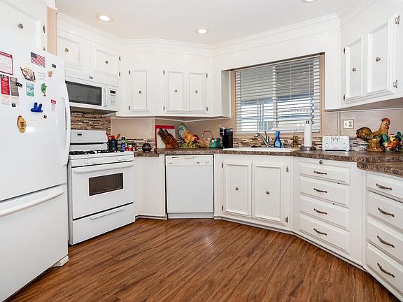This spacious, 2 bedroom, 2 bath beautiful home in the highly desirable Palomar Estates East boasts 1920 square feet. This home has a great floor plan complete with partial dual pane windows and ceiling fans throughout. Upon entrance you are greeted with lots of natural lighting, carpet and a built in hutch at dining room area. The kitchen has abundant white cabinets, recessed lighting ,pantry, built in maytag microwave and fridge and a frigidaire gas stove. The family room has a beautiful stone fireplace to keep you warm on those chilly winter nights. Guest bedroom has a walk in closet and dual pane windows. The primary bedroom also has dual pane windows, ceiling fan and a spacious walk in closet. Primary bath has a separate tub and shower, dual sinks and lots of cabinet space. Washer and dryer are included and located near carport entrance. Outdoor patio has views of the foothills. 2 sheds included. Lots of great amenities in the park include pool, spa, sauna with indoor showers, pickle ball, bocci ball, putting green, dog park, community garden area, weekly activities, Bingo, car wash, and more! Walking distance to a lot of restaurants and shopping, etc. Only about 8 miles to the beach. Someone living in the home died peacefully within the last year. Once in escrow the buyer must get park approval. space rent is $577.46 under rent control. pets are ok, 1 dog, 1 dog and 1 cat or 2 cats, weight restrictions check with management for pet approval. NO PROPERTY TAXES, ON REGISTRATION