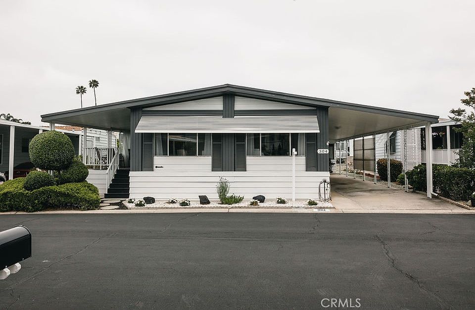 Welcome to your new home in the highly sought after Palomar Estates East 55+/35+ community. This home has been thoughtfully updated but still has some original charm. A generous 1776 square feet 2 bedroom, 2 bathroom triple wide home is move-in ready. The property has been painted inside and out, ceilings scraped and retextured, new flooring, new roof, new garbage disposal and completely re-piped. The front porch has been redone and makes the perfect place to enjoy your morning coffee or relax and read a book. The living room and family rooms are spacious and bright and make perfect spaces to entertain. The kitchen cabinets have been painted and updated with new hardware, but the original charm of the appliances bring a warm vintage feel. A large primary bedroom and bath boast a walk-in closet, dual sinks vanity and separate shower/tub and a second bedroom with amazing natural light just off the second bathroom. Even with the mature landscaping on the lot - including a beautiful and high producing Valencia orange tree - there is still room if you want to add additional plants or garden boxes to give it your special touch with plenty of extra storage for your garden tools in the attached shed. This home is on annual HCD registration - NO property taxes AND the park space is rent controlled!
