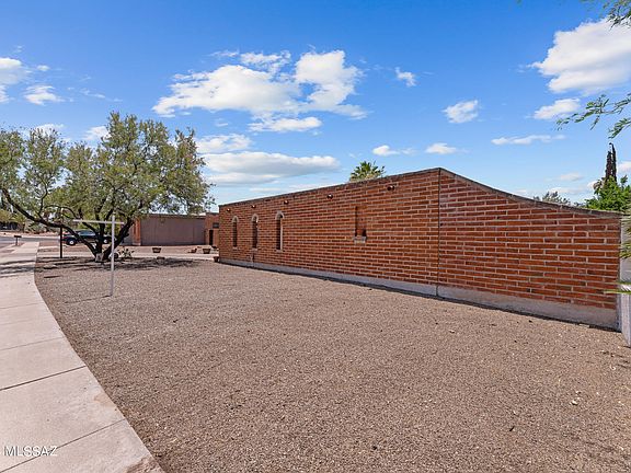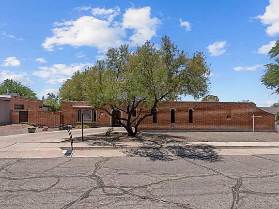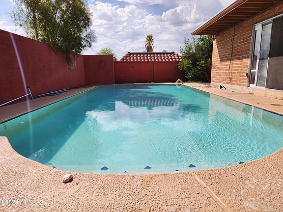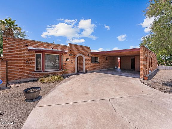 Experience Tucson's authentic charm in this 4-bedroom, 2-bathroom home. VA 2.875% which could be assumed. Constructed with beautiful burnt adobe brick, this property expertly combines traditional elements with modern conveniences. The interior offers spacious living areas. The property is accented with mature trees that add a sense of serenity to the open space. A key outdoor feature is the pool, complemented by a covered patio area - perfect for soaking up the Arizona sun or hosting get-togethers. The carport hosts an entire attached workshop, ready to be altered into a charming Casita. Schedule a Private Showing Today! Property has Solar Panels with Solar Loan that must be assumed with sale.