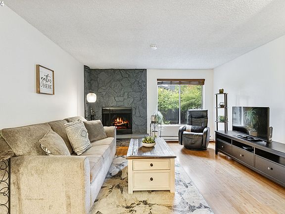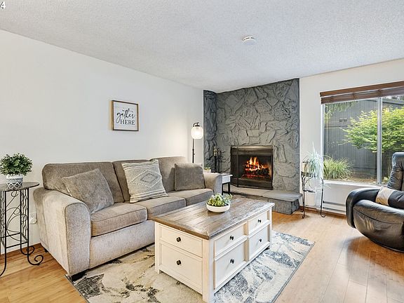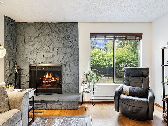 Oh what a joy this easy living sanctuary is! Nestled in the heart of Beaverton this tucked away community is a true treasure. This home is one level no stairs in and out of the unit. Backing to a lush green backdrop you will find this to be a very tranquil space for work and home life. Please enjoy the experience of a newly renovated kitchen with new cabinets, quartz slab countertops, tiled floors, custom backsplash, built-in microwave, glass top range and room to dine with family and friends! You will find gorgeous bamboo flooring and engineered hardwoods in the main. Enjoy a true primary suite with its own bath. Both baths have been refreshed. Enjoy the ambience of a wood burning fireplace to keep you cozy over the holidays! There is an abundance of storage space w/ spacious closets in both bedrooms and two more closets in the hallway. The outdoor covered patio has an additional storage closet. This lovely ground floor home looks on to a lush green backdrop! The location is so convenient with easy freeway access, close to shopping, charming local restaurants and cafes in downtown Beaverton. It is just across the street from Nike. Enjoy community amenities, pool, sauna, recreation/party room, weight room, garden and playground. Hoa includes garbage, water and sewer. This home is truly ready for you to move in, relax and fall in love!