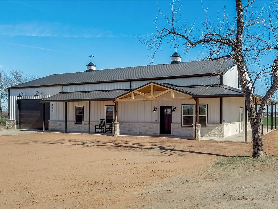 Here is your chance to own a beautiful Barndominium on 1.25 acres in Van Alstyne! As soon as you enter this home, you will fall in love with cathedral pine ceilings, abundance of natural light and bright colors. It is an open concept home with huge kitchen island, plenty of storage space, a great size game room upstairs, designer finishes throughout the home. Forth bedroom has it's own separate entrance from the garage and to the back yard, half bathroom and a split AC unit. It would be an ideal space for an office, house guests or that messy teenager.