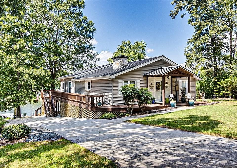 Badin Lake home features 100 ft of water frontage! Stunning water views near Circle Landing, 14'deep water channel-per seller, 1 covered boat slip w/hoist & 2 open floating slips w/double jet ski floaters. Waterfront sundeck & additional 32x10 deck boasting 4 exterior speakers is perfect for hosting your next gathering. Feel secure w/6 outside cameras w/recorder & monitor included. Beautiful 3-bedroom, 2-bath home has a fresh coat of paint this year, new HVAC & all duct work replaced 2022. Great room boasts a vaulted ceiling while the cozy LR features a rock FP & hardwood floor. Renovated kitchen in 2019 has new cabinets, SS sink, quartz counters & all SS appliances remain including W & D. Primary suite features double doors leading to the relaxing sunroom, perfect after a long day. One bedroom without closet. Uwharrie National Forest is minutes away & provides opportunities for hiking & camping. Picturesque water views, spacious 1/2 acre lot & relaxing evenings on the lake awaits!