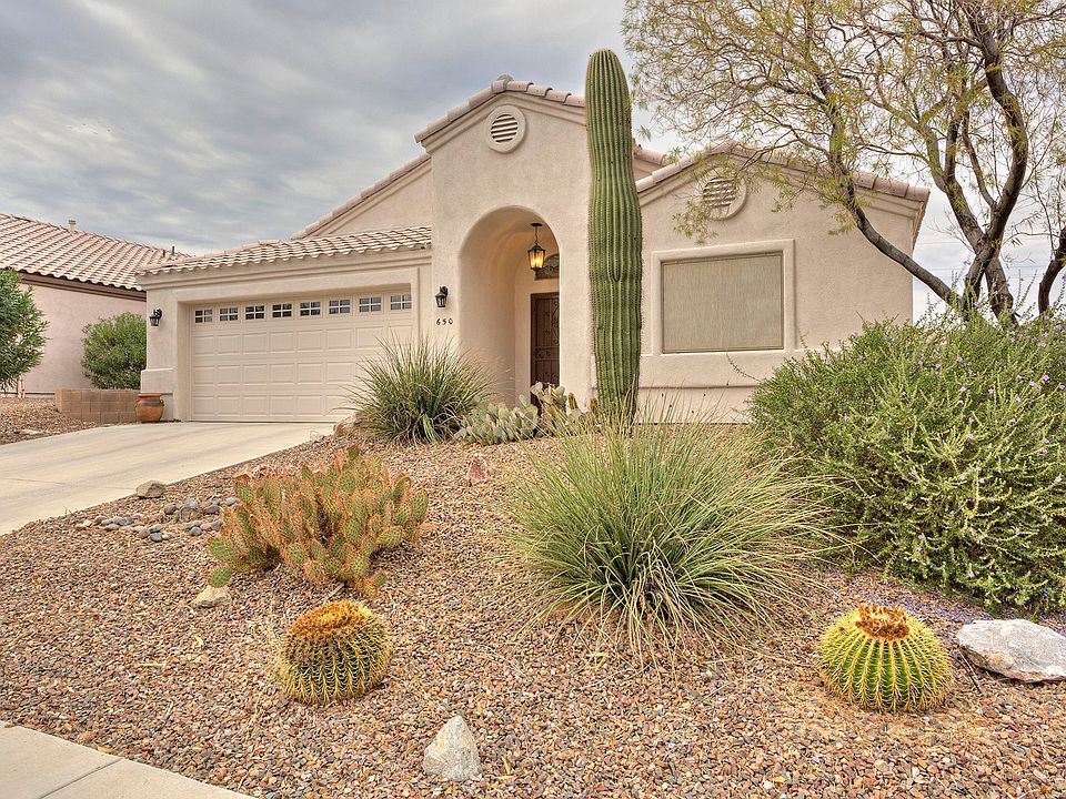 Charming home in popular 55+ Desert Creek. 2 BR, 2 BA +Den, 1,400 sq.ft., Ceramic tile floors throughout. Upgraded kitchen cabinets with crown molding, center island, tile back splash, gas range. Den with french doors. Great room w/gas fireplace. Master BR has 2 generous closets, one is a walk-in. Security screened covered rear patio. Separate walk-out from MBR to backyard also has security doors. Laundry closet w/gas dryer. Large backyard. Recently painted exterior.