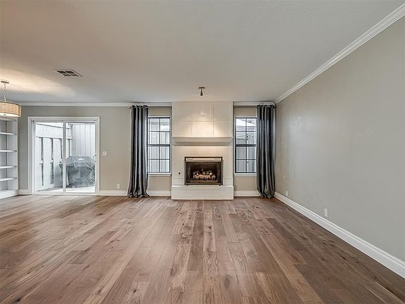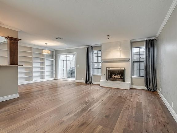 Welcome to this spacious 2-bedroom, 2.5-bath townhome in a desirable gated community in northwest Oklahoma City. The beautifully updated kitchen features a stylish new backsplash, granite countertops, and stainless steel appliances, all complemented by beautiful wood flooring. The living and dining area includes a large built-in bookcase, adding both style and functionality.