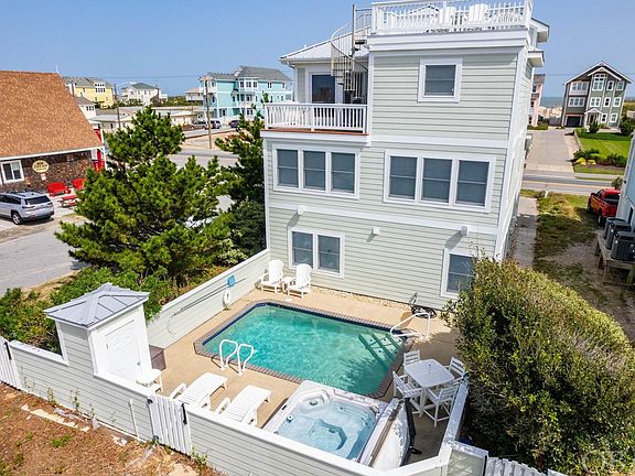 This exceptional home was custom built for the owner, by B D &A has never been rented and has been meticulously maintained. Superior quality, great attention to detail and timeless decor distinguish this property. Noteworthy are the wainscoting, decorative bath tile, oval window, custom lighting, wood flooring, themed artwork and carefully selected Restoration Hardware furnishings. The east wall of windows on the top level provides brilliant light and expansive views of the ocean. The open floor plan is perfect for socializing, dinning, cooking and viewing nature from the ocean and sound side decks. A roof top deck is accessible from the room's west side deck. This upper deck offers panoramic views of sunrises and sunsets and a breathtaking connection to nature. There are three ensuite bedrooms on the mid level. Their generous size ensures privacy and quiet. The spacious east side bedroom has its own private ocean side deck. On the lower level are two bedrooms (one is ensuite), two full baths, a wet bar and a recreational room that opens to the pool and hot tub. This classy home is centrally located and is a short distance from restaurants, grocery stores, retail shops, entertainment sites and Jennette's Pier. The home is easily enjoyed as a private residence or rental property. There is deeded ocean access/boardwalk directly across the street. Recent upgrades include a new metal roof, exterior paint and interior paint touch up, a new HVAC, peat replacement in the septic, hot water heaters and refrigerator.
