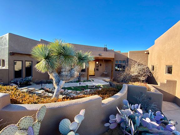 Experience the true spirit of the southwest, complete w/panoramic mountain views in this sprawling single level custom built Santa Fe home on 2+ acres. Timeless architecture greets you, from the gated courtyard w/nature inspired babbling stream & waterfall feature to the custom interior that boasts an expansive great room, wood burning stacked stone fireplace & adjacent bonus room for open concept living. Viga peeled pole columns & beams, authentic flagstone flooring, wood windows & doors, intricate natural stone tile features and 12' ceilings highlighting latilla wood inlays reflect the organic beauty of the interior. The 480 sf deck w/fireplace is perfect for entertaining & captures the authentic beauty of the outdoors. 3CG offers workshop space & storage. Possible on-site RV parking.