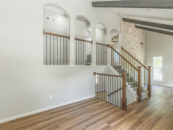 The new LVP flooring complements the rustic beams that adorn the high ceilings. The living spaces are bathed in natural light streaming through the windows, enhancing the airy feel of the home.