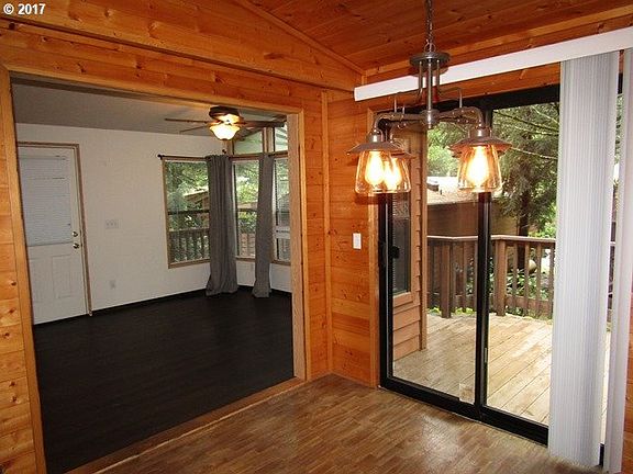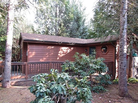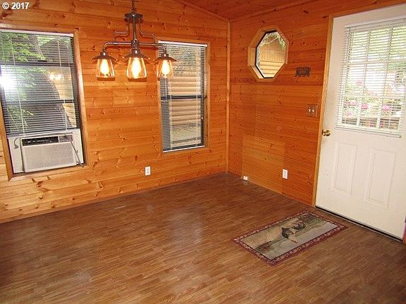 Nice little cabin with vaulted ceilings. New laminate flooring in living room. Very cute setting, lots of amenities included in space rent. Wrap around deck. Located in Mt. Hood Village Resort which is a gated community. Cash only!