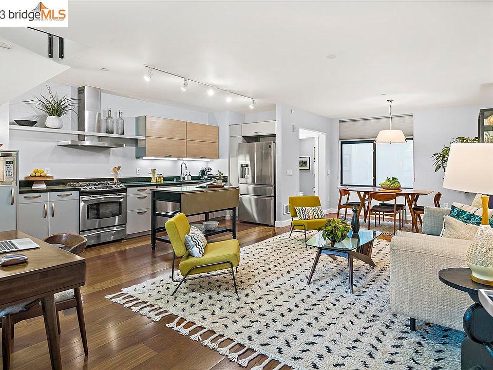 A swank, luxurious 2-bed multi-level condo with in-unit laundry, and a private balcony. At the main level, the chef style kitchen features Energy Star appliances, generous counter space, and StudioBecker bespoke cabinetry. Designed in an airy open-plan style the main level is great for entertaining and day-to-day living. Stairs lead to bedrooms at the second-floor level. Warm and natural light, the soft hues of its walls, and its brand-new carpeting lend the 2nd-floor a cloud-like and intimate feeling. You’ll be in awe at the size of its primary bedroom with peek-a-boo views of SF from its windows and balcony. A spacious 1/2 bath is located at the main level. A spa-like bathroom with a soaking tub is on the 2nd level. HOA amenities include a community room and a rooftop terrace with a BBQ and dining area with views of SF. AIA awarded and designed by architect Jim Orjala in 2006, San Pablo Heights is no cookie-cutter project. Its sweeping visual lines meld materials of stucco, aluminum, wood and glass into a brilliant and calming work of art. Food, art and maker culture thrive in this vibrant and super convenient NOBE neighborhood. Kitchen-on-Fire Cooking School, Wondrous Brewery, Paradise Park Cafe, City Sports and the Emeryville Greenway are among places near and dear.