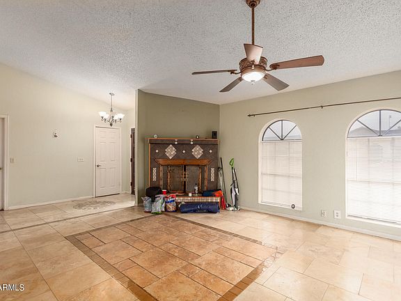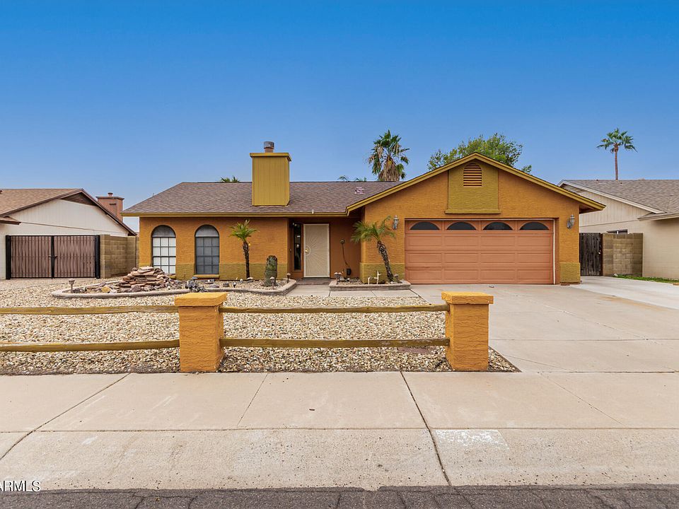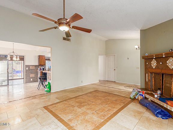 Come and see this adorable home in Glendale! This 3-bed, 2-bath property offers a 2-car garage, a low-care landscape, and an RV gate. Inside, you'll find a neutral tile floor in all the right places, vaulted ceilings, a spacious living room w/a fresh palette, and a cozy fireplace. The quaint kitchen boasts tile counters & backsplash, oak cabinets, and SS appliances. Get a good night's sleep in the primary bedroom, which includes direct access to the AZ room, a walk-in closet, and a private bathroom with dual sinks. The AZ room can be turned into a 4th bedroom. The backyard provides a covered patio, a desert landscape, a standalone fireplace, a shed for extra storage, and a play pool w/water features. No HOA! What's not to like? Don't miss it! Please take a tour before it's gone!