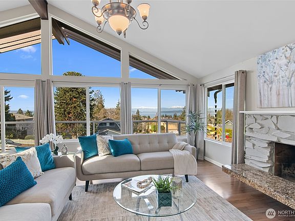 Beautifully updated contemporary abode with awe inspiring Sound & Mnt Views! Open concept plan boasts vaulted ceilings, walls of windows, newly refinished & stained wood floors, & many high-end finishes throughout. Well designed Chef's kitchen w/slab granite, eating bar, custom wood cabinets & modern rock wall. Entertain guests on the oversized newly rebuilt view deck & lower level covered courtyard all while enjoying the sea & mountain vistas! Fully permitted ADU unit, complete w/ 2nd kitchen, wet bar, private laundry, bedroom, new carpet & separate entrance! Energy-saving solar panels, ensure efficiency & sustainability. Corner lot w/ beautifully landscaped grounds & stamped concrete walkways. Walk to Starbucks, Thriftway market & more