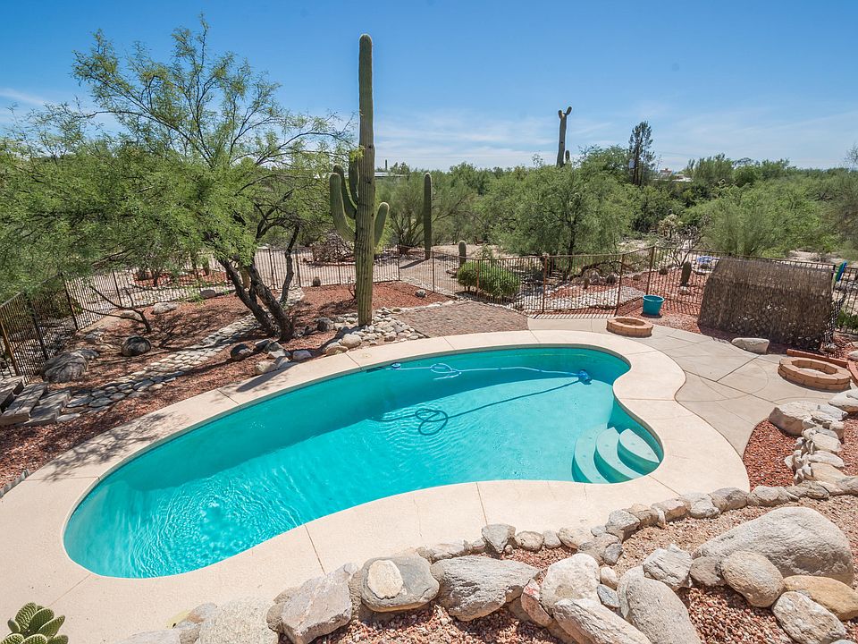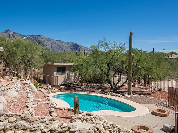 This lovely updated Foothills home is nestled on a quiet .98-acre cul-de-sac lot and features nice mountain views, gorgeous remodeled open kitchen with elegant cabinets, glass fronts, pull outs, Corian counters, stainless steel appliances & stunning wood floors. Other features include spacious living room w/large picture windows and fireplace, split floorplan, master suite with 2 pedestal sinks, separate shower & tub. Walk out the kitchen slider to the private terraced backyard w/tons of character, sparkling pool, low care desert landscaping with saguaros plus storage/workshop. Cross the patio to the large bonus room with 3/4 bath, ideal for guest quarters, office, studio, man cave, etc. Terrific neighborhood close to awesome shopping, dining, schools and an easy commute to U of A & downtown