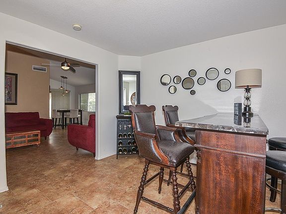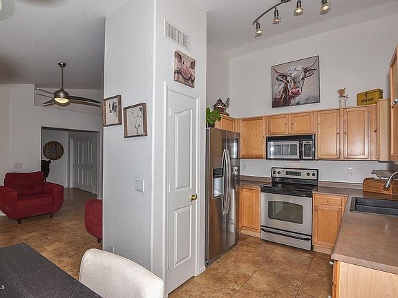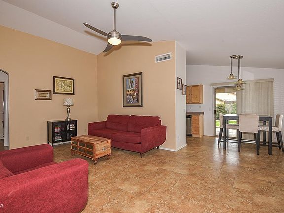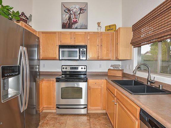 Great home in a great area! Corner lot with mountain view. Lots of upgrades. large 20 inch tile, entry, kitchen, great room, bathrooms, halls. Move in ready. Amazing mountain view and beautiful lush grassy backyard, mature trees, watering system front and back, covered patio. Master bedroom walk in closet. New garage door opener. Stainless steel appliances, upgraded light fixtures. New blinds in front room and kitchen. Cabinets in garage with new garage door and opener. . The 3rd bedroom is set up as a den but has a closet and entrance into the hallway making it easy and conversion.