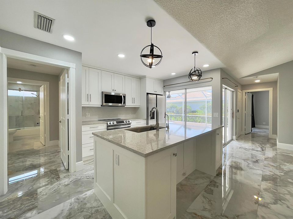 Beautiful, completely remodeled 2 Bedroom 2 Bath villa in the heart of Palm Beach Gardens. New Kitchen, bathrooms and flooring. Contemporary Island kitchen design. Light & Bright open floor plan with split bedrooms. Designer Paddle fans, porcelain tile floors, accordion hurricane shutters and a huge screened patio with plenty of room to barbecue and entertain. Easy, 1 story living. 2 Assigned Parking spaces. Great Cul-De-Sac location. Sun Terrace at the Oaks is a terrific community with heated pool and close to all the shopping at the Gardens Mall, Downtown shoppes and all the casual & fine restaurants along PGA Blvd. 12 minutes to the beautiful beaches and and 15 minutes to the airport. The Oaks is a hidden gem. Great home, perfect location. Terrific Value.