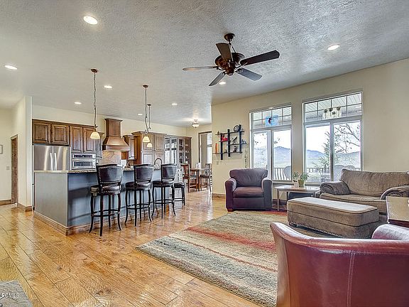 This home located in Trailside, minutes from miles of trails. The home is light-filled & takes in ski resort views in nearly every room. Great room features a floor-to-ceiling fireplace & access to a large deck made for entertaining. The open kitchen's wrap around island seats 6 and features granite counter tops, a 5-burner gas stove, custom cabinets, & an eat-in dining area that takes in the views.The large master suite has its own access to the deck and views & has a large walk-in closet, jetted tub, & shower. A formal dining room, two additional guest bedrooms, a powder room, 1 full bath, a mudroom/laundry, & a 4-car garage finish the main level. The lower level walkout you'll find a large family room with a gas fireplace, full kitchen, three bedrooms & extra storage/workshop. The family room opens to a lower patio with entertainment space & access to the back yard & hot tub. Back yard has a garden plot & RV parking. Walk right out your back door to access the trail to Round Valley