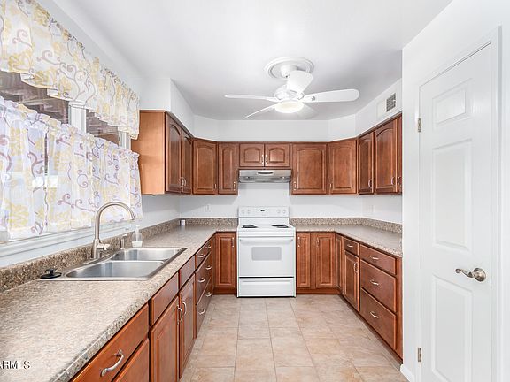 This home has been lovingly maintained & features easy-to-clean hard-surface flooring, great natural lighting, roll-in shower, wide doorways & hallway, wheelchair-friendly entrance, raised toilets. Subflooring beneath tile reinforces strength. Eat-in kitchen - pretty cabinets & plenty of storage. All appliances included. Carpeted den is adjacent to living room - 2 steps down - for reading, TV watching, hobbies. Workshop/storage/man cave in grassy back yard. Detached 2-car garage. Entrance to inside laundry is off back patio. Extra insulation throughout. New water heater. Block wall surrounds property, affording privacy. No HOA. Located near Glendale Community College, Glendale Public Library, elementary schools, post office, bus, freeways, shopping, and dining.