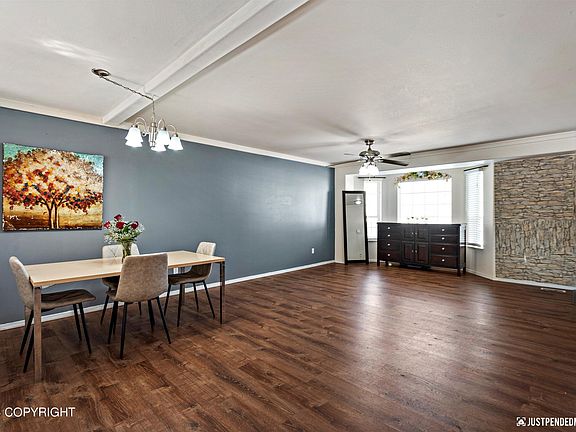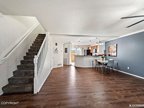 Perfect starter home! 3 bedrooms, laundry room, and full bathroom conveniently located upstairs. Open concept kitchen featuring stainless steel appliances, sliding glass door off of kitchen leading out to a private fenced in area. Newer laminate flooring installed downstairs, carpets have been professionally cleaned.Conveniently located 5 minutes from JBER and Downtown, the commute is ideal
