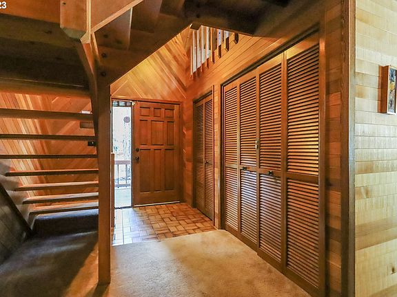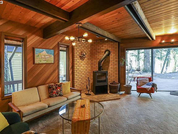 This unique Mt Hood home with views of, and private walking trail to, the Sandy River incorporates both chalet and A-frame architectural design with vintage charm. Boasting primary suites on both the main and upper floors, as well as two additional bedrooms and bathroom opposite of the primary. The 2020 Rais high efficiency wood stove in the living room will keep you cozy on those cold days/nights. Great room floorplan with a smartly designed kitchen that has an eat-at bar with cooktop and new hood, dishwasher, and range. The large dining area showcases the impressive, vaulted ceiling. Main floor primary bedroom suite with spiral staircase leading up to a private room has a separate shower & jetted tub and French doors leading out to the backyard. Upper level has loft style family room just outside the second primary suite with private deck. In the back yard you will find a firepit with built in seating, a new stone patio, and a hot tub installed in 2021.For extra storage you will find two sheds for tools, skis, snowboards, bikes, etc. You won't want to miss this rare beauty located directly between Sandy and Government Camp --15 miles to each!