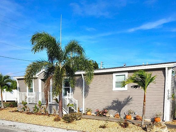 This 2018 Palm Harbor "VENTURA VI" model Double Wide manufactured home offers Three bedrooms and Two baths (1,432 sq ft), plus a detached 18'x20' double Garage in the highly desired, active 55+ Trailer Estates community. Buyers wait months for new models to be manufactured and installed, but you can MOVE right in! Located on a quiet street, you are greeted by a large front porch with notched entryway leading into bright, open-concept living and dining spaces. All drywall interior. Large kitchen island/breakfast bar. Primary Bedroom suite with roomy walk-in closet and dual sinks in the Primary ensuite Bath. The split floorplan provides two more Bedrooms and an additional Bath with plenty of room for guests. Separate Laundry Room just off kitchen with built-in shelving. A spacious rear deck is perfect for relaxing or entertaining. Lot is 6200+ sq ft with a single annual lot fee. No lot rent, you own the land. Park Fees are included into annual real estate taxes. Boaters have direct access to Sarasota Bay from the Marina. Trailer Estates community offers so many options for a great day! Enjoy the large, heated community pool, hot tub, gym and wood shop. The community buzzes with pickleball, shuffleboard, kayaking, horseshoes, bocce, dancing and more. A US Post Office on site. 10 minutes to the SRQ Airport. Convenient to shopping, restaurants, the Arts and everything in Bradenton/Sarasota. Sold unfurnished. Bring offers!