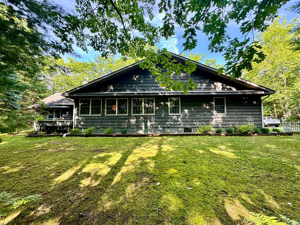 This custom home on the 12th green of Indian River Golf Club boasts a well-designed floor plan maximizing space. It features multiple living areas: a spacious living room with a fireplace, a family room with golf course views, a custom kitchen open to a breakfast nook, and a formal dining area. The master suite is located opposite two guest bedrooms for privacy. An office area is perfect for remote work. The large basement includes a custom wood shop, bathroom, and ample storage or expansion space. Outdoor seating is enhanced by an open deck and covered porch. Additional features include two garages, a paved driveway, high-speed internet, and a whole-house generator.