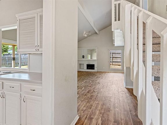 Charming home with a distinctive floor plan! Enter to find beautiful hardwood-style flooring. Straight ahead is the living room, while the kitchen is to the left, featuring a pass-through window overlooking the living area. The kitchen's tile flooring seamlessly transitions into the dining area, which includes a washer/dryer closet, garage access door, and well-placed corner windows with a view of the backyard. The kitchen is equipped with adjustable spot lighting, a vaulted ceiling, a pantry, and a deep farmhouse-style sink. The spacious living room offers a gas fireplace and French doors leading to the backyard. The hallway leads to two bedrooms, each with double-door closets and ceiling fans. The guest bath between the bedrooms features a clawfoot vanity. Upstairs, a lovely loft area leads through large double doors to the expansive master suite, which boasts a ceiling fan, an oversized shower, a gorgeous double vanity, and a walk-in closet. Additional features include an in-ground storm shelter in the garage and a partially wrap-around backyard with raised garden beds.
