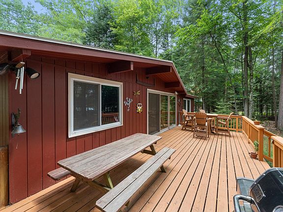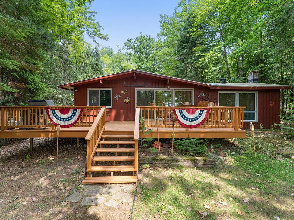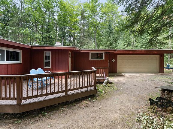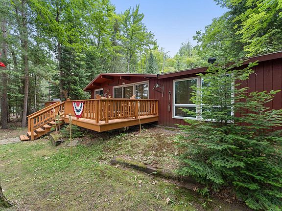 This gem of a property is a must see! The quieter side of life on the Three Lakes Chain, this year round home is located on the thoroughfare with nearby easy accessibility to Big Lake, with panoramic water views, 200' of level frontage that's a mix of sand and fisherman weed shoreline. This area on water is teeming with wildlife: trumpeter swans, wood ducks, loons and an occasional bald eagle may be found nearby. The property has been well maintained with numerous updates over the years, a remodeled kitchen and fabulous wraparound deck. See Feature Sheet for all the upgrades and additional features of the home. This traditional Timbershore dwelling offers the warmth of a knotty pine interior with vaulted ceiling, two wood burning fireplaces/ brick and freestanding/ in both the living and family rooms. Forced air with A/C, an attached garage and a newer cedar pier (2021) is included. Internet set up, so all is here for an easy lake life in the Northwoods-- make an appointment today!