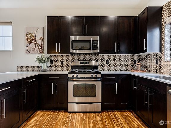 NO HOA DUES! This lovely West Seattle townhome is full of light and architectural interest! Lightly lived in, modern townhome just outside High Point: enjoy the parks and paths -yes!- NO HOA dues! Spacious main level kitchen with custom cabinets, quartz counters, tile backsplash and stainless steel appliances with gas range. Stunning zebra bamboo hardwood floors, gas fireplace. Upstairs has two large light and bright bedrooms with vaulted ceilings, each with their own bath (functions as 2 primary BRs). Partial view of Capitol Hill and the Cascades. 1st Floor bedroom makes a great office. Fully fenced yard. New paint. Attached 2-car garage. Enjoy the West Seattle lifestyle! Walk to parks, restaurants and stores. Easy commute to downtown.