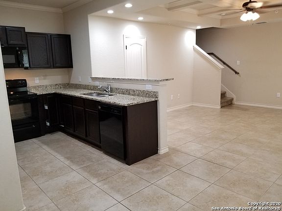 RENT INCLUDES WATER AND SEWER SERVICE. Base rent is $1350 plus $70 for water/sewer. 3 Bedroom, 2/12 bath, 1 car garage townhouse style unit in a 4 Plex. Close to IH 35, 1604. Features high ceilings with square tray crown molding in living room. Granite kitchen counter-tops, black contemporary appliances, overhead microwave, dishwasher, stove/oven. Refrigerator included. Ceramic tile flooring in 1st floor, carpeting upstairs. Washer/dryer hook ups in garage. Privacy fenced back yard.