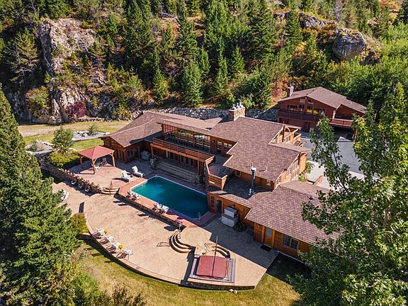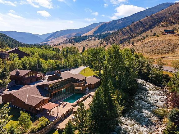 South of Red Lodge, Montana is the extravagant property called the Point of Rocks! Situated directly over the sparkling waters of Rock Creek on 3.91 acres is a main lodge, a guest house, and a loft. This is a turn-key enclave provided with lavish furnishings and décor. The setting is picturesque surrounded by the rugged Beartooth Mountains at 6000 ft elevation. Relax lazily next to the flowing waters and fish Rock Creek! Once you enter the property through the electric gate and crossover that log bridge, you'll never want to look back. There are 3 separate buildings: the main house with a swim-up pool and 6,978 sq ft; the guest house with 3 bedrooms and a deck overlooking the creek; and the studio loft sitting over an oversized 2-car garage.
