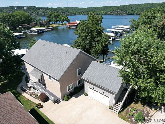 Welcome to this stunning 8 bedroom, 4 bath Cape Cod style lakefront home in the sought-after Lake Acres Subdivision at the 23 MM of the Osage Arm. Offering 3,000 SF of living space, this home is designed for lake living and entertaining with soaring lofted ceilings and breathtaking 3-story lake-facing windows that fill the home with natural light. A detached 2-car garage with workshop above provides ample storage and hobby space. Outside, enjoy a 2-well dock complete with a waterslide, rope swing, and spacious seating area—perfect for endless fun on the water. The property includes an additional second-tier lot featuring a carport and storage shed, adding even more value and convenience. Nestled in a cove with incredible main channel views, this home combines serenity, incredible views, and unmatched access to all the Lake has to offer. Whether you’re seeking a full-time residence, vacation getaway, or investment opportunity, this property is everything you are looking for!