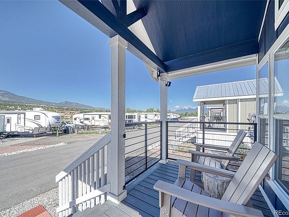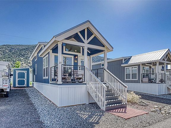 FURNISHED!! Lightly Lived-in Park Model Home located in the Salida RV Resort. Fully electric 399 sf, 1 bed/1 bath Park Model with in-unit laundry, ample storage, open floor plan, private bedroom and low-ceiling lofted area. This unit is being sold furnished and several upgrades have been made to the unit, including: keyless front door access with WiFi capability, remote WiFi capable thermostat controls, in-shed storage system, countertop dishwasher (complete list of improvements and furnishings is attached to this listing and/or available through listing agent). Efficient floor plan offers living area with designated wiring for entertainment system; kitchen farm sink; three-quarter bath off kitchen; private bedroom nestled at the back of the unit with closets and built-in dresser. Unit is skirted with front steps and 6' covered front porch. Two off-street parking spaces in driveway, 10'x6' storage shed and basic landscaping are included. With over 1600 feet of Arkansas River frontage, Salida RV Resort offers big mountain views of the Collegiate Peaks to the west, a playground area, a riverside park, picnic area, pickle ball court and dog run. Resort Clubhouse offers communal space, coin-op laundry, locker rooms, conference room, and a workout room. High speed internet is available. Monthly lot rent is $648 and includes water, sewer, trash, snow removal and landscaping maintenance. Designed with eye to affordable luxury and a desire to build community, Salida RV Resort is a new 4-season park with new amenities situated in the heart of the Arkansas River Valley. Excellent proximity to a full spectrum of outdoor activities and just 2.5 miles from Salida's vibrant Downtown Historic District. This unit is 2023 Athens Park Series APS 528.