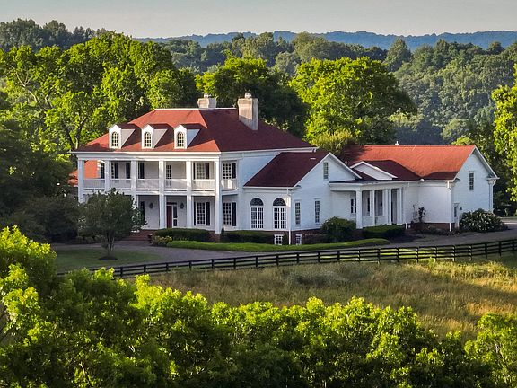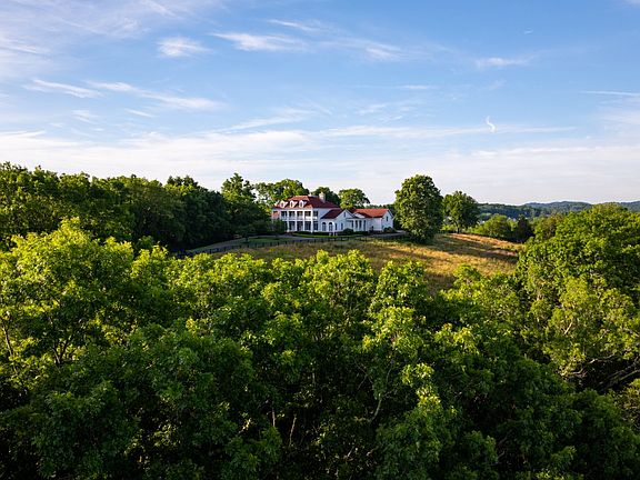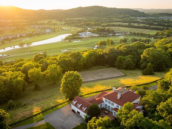 Views for miles from this exquisite home situated atop one of the higher hilltops in College Grove. This 21 acre equestrian property includes 100 x 200 arena with German geotextile footing, five stall barn, two-bedroom guest house with workshop below, observation deck for sunsets and even has a cave for exploring. The treelined winding driveway is flanked by black four board fencing. It leads you up the gentle slope and reveals the grand double porches and riding arena. The front double porches provide views of sunrise and views of The Grove Golf Course. Covered side porch and area for pool in the rear for sunset views. Primary bedroom is on the first floor and there are four bedrooms on second floor in this 6,500 sq ft floorplan. First floor also includes a formal study and sunroom. There is opportunity to expand into the unfinished basement with a separate entrance. The barn features conditioned tack room, office with bathroom and full loft. Country feel yet close to amenities.