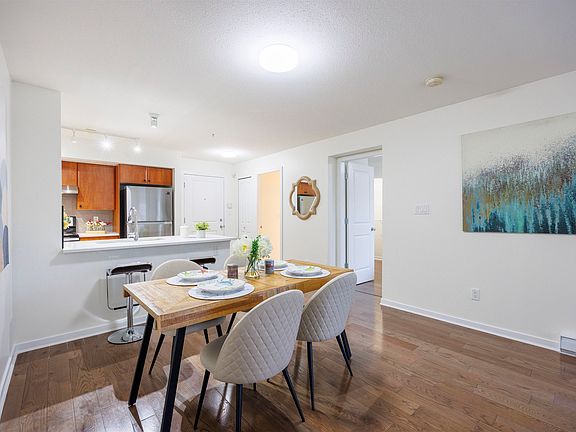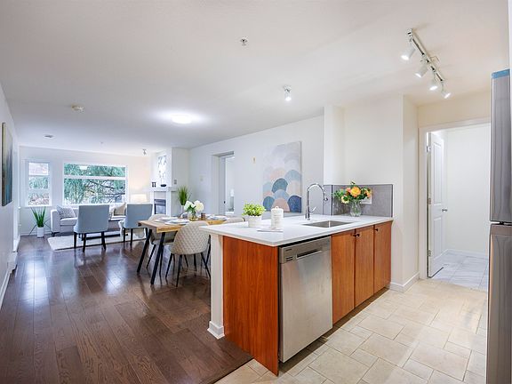 South-facing two-bedroom homeAiry ambianceSpacious balconyOpen-concept functional layoutCozy gas fireplaceNew paintQuartz countertop