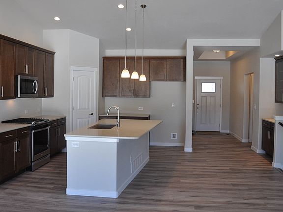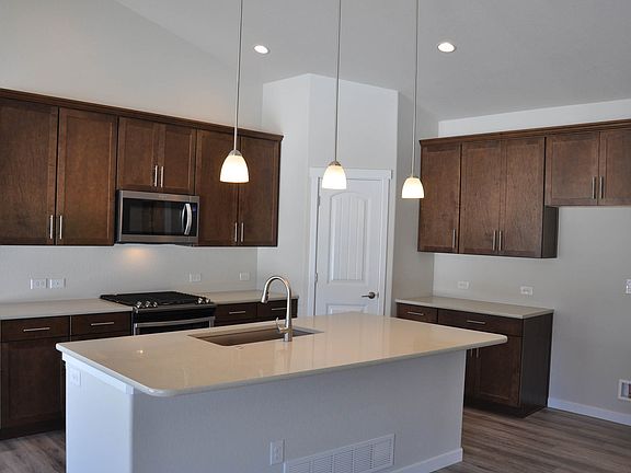 Ready in March.. Parade ranch plan with 3 car garage in Banning Lewis Ranch. 4 bedroom, 3 bath home with finished basement. Kitchen features maple cabinets with 42" uppers and crown molding. Quartz counters, stainless steel appliances and 5 burner gas cook top. Home includes fireplace in great room, barn door at master, gas line to range and air conditioning. Finished basement includes 1ft taller ceilings plus 2 bedrooms, 1 bathroom and recreation room. Exterior living includes covered deck.