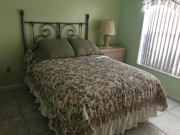 Property Id: 176648 Ground floor fully furnished Condominium apartment. Central A/C and Heating. Master bedroom with brand new Queen bed, Armoire, Dresser and 2 night tables with lamps, Ceiling fan and large closet with shelf. Wonderful view of pond and lighted water fountain from the Master bedroom. Guest room has a full bed,dresser with mirror,closet and night table with lamp. Living room has matching sofa bed,love seat and chair, coffee table & matching end table. Kitchen includes washer & dryer, refrigerator, microwave,coffee brewer,toaster,stove & oven, dish washer & sink. plenty of cabinet and storage space. Back porch has a table and 2 chairs and windows that can be opened or closed for different seasons or temperatures. There's also a storage closet in the porch area. Beautiful view of the pond and lit fountain in the night. One private & covered parking space is included with the Condo rental.