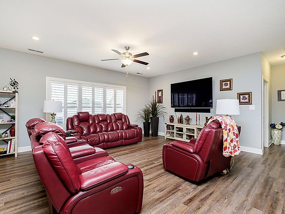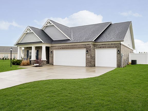 Nestled in the heart of a quiet cul-de-sac, this impeccable craftsman-style ranch promises the pinnacle of modern living. Carefully crafted with a keen eye for detail and boasting a seamless open concept design, this 3-year-new gem is a true testament to quality and comfort. As you step inside, be greeted by 9-foot ceilings and the charm of plantation shutters on every window, casting a warm glow across the living space.Popular LVP flooring throughout the main living area adds both elegance and durability to every step you take. Featuring 3 spacious bedrooms and 2 full baths, the Primary retreat is a sanctuary unto itself, with a private bath boasting dual vanities and tile shower and floors. Plus, the convenience of a mudroom with storage cubbies and a laundry room seamlessly connected to the primary walk-in closet ensures both practicality and convenience. The heart of the home is the kitchen. Upgraded cabinets with soft-close doors, granite countertops, tile backsplash and high-end appliances, including not one, but two ovens, make this kitchen a focal point. A center island provides the perfect spot for gathering with loved ones, while a walk-in pantry ensures ample storage for all your culinary delights. Car enthusiasts will love the expansive 3-car garage, providing ample space for vehicles, hobbies, and storage. Outside, the large lot is surrounded by pristine vinyl fencing for privacy and security, while an Amish-built shed offers additional storage solutions for all your outdoor needs. Conveniently located near I-69, commuting is a breeze, while many will appreciate the proximity to Pendleton Schools, with the added convenience of the school bus running down 400 S.