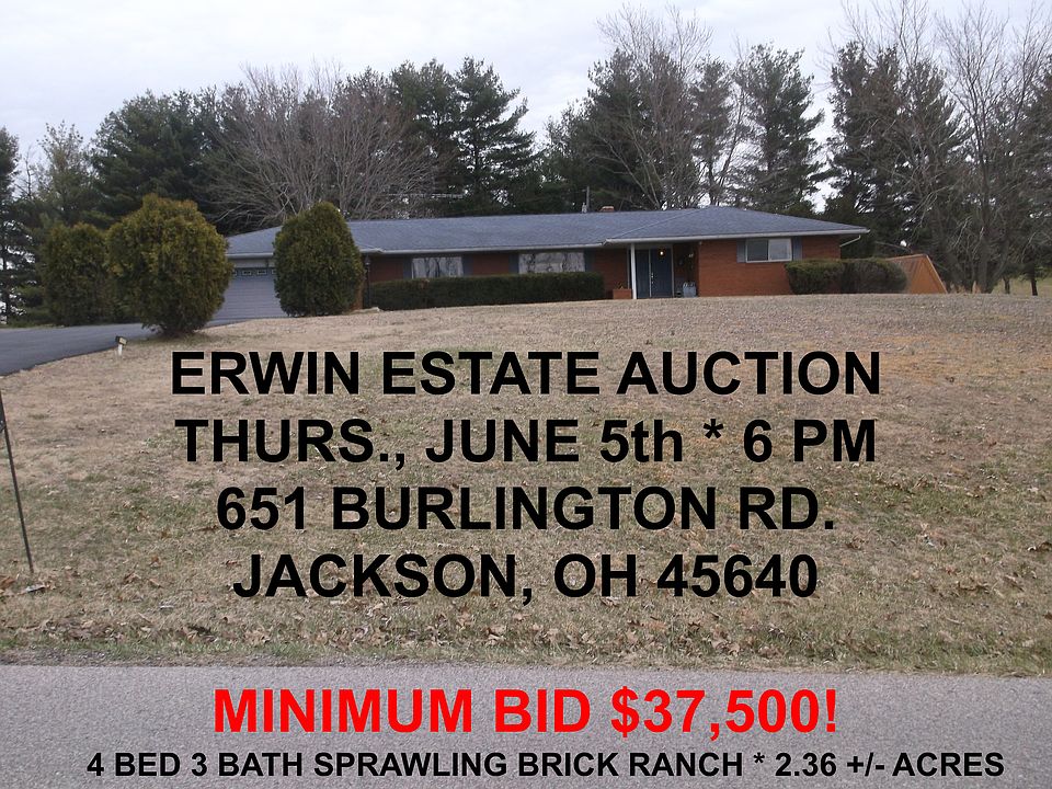 ERWIN ESTATE AUCTIONThurs., June 5th at * 6 PM * Open Houses: Mon. May 19th & Wed. May 28th from 5-6 PM 651 Burlington Rd. Jackson, OH.MIN. BID $37,500! SOLD TURN-KEY.Sprawling Brick Ranch 4 Bed 3 Bath home w/ basement & att. 2 car finished garage, workshop area, door opener & concrete floor. Majestically perched on a mostly level hilltop lot close to town overlooking the retail business area & Holzer Med. Center Appalachia Valley! Asphalt drive w/ turn around & basketball court leads to home. Main floor: Formal Living Rm; Formal Dining Rm; Huge open concept Kitchen, Dining Rm, Family Rm Combo offering Kitchen w/ 17 ft. top & bottom cabinetry & Family Rm offers MASSIVE EXPOSED BRICK Hearth Wood Burn Fireplace; (3) Bedrms w/ closets; Full Bathrm w/ shower; Full Bathrm; (2) Linen Closets; Master Suite w/ (2) double door closets & attached full shower bathrm. Utility Area w/ cabinetry & washer/dryer hookup. Homes basement consists of 2 rooms with carpet and shelving.Call 740.775.3330