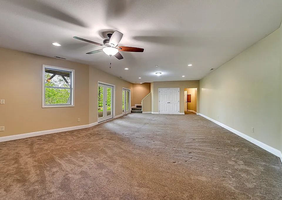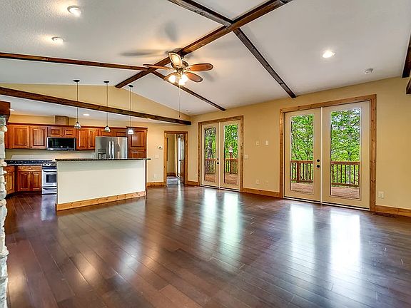 Stacked rock fireplaceBreakfast barSpacious deckFenced backyardGranite countertopsTwo shedsOpen concept design