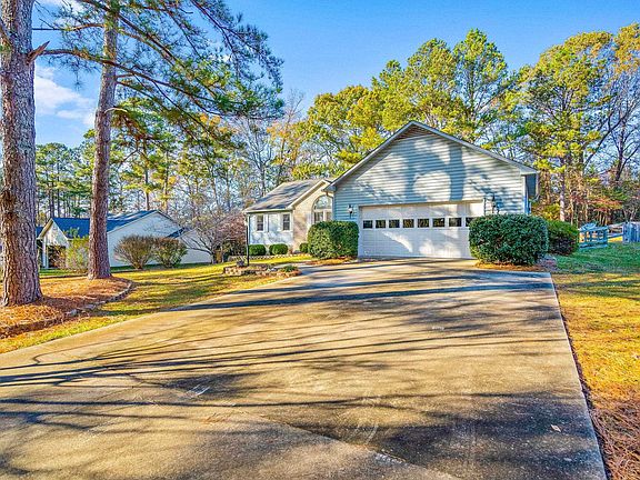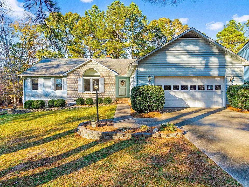 One level living in the highly desirable gated community of Carolina Trace! Once inside the neighborhood, you will enjoy your scenic drive home over rolling hills, taking in lake views, winding around a manicured golf course and established landscape. The great size master bedroom offers double closets, separate tub and shower, and double vanity. Relax on the large back deck overlooking your fenced in backyard! The master bedroom carpet was taken up. Listing photos will show a before and after with virtually staged gray carpet.