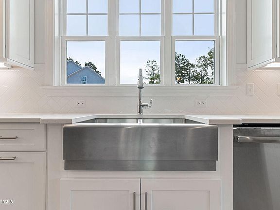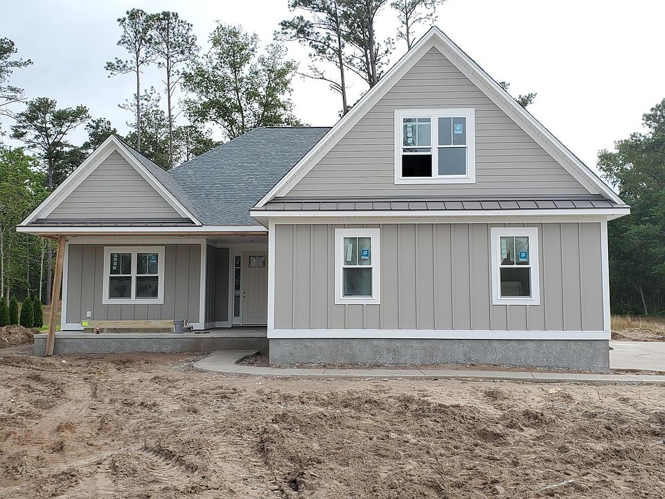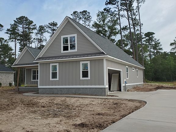This charming coastal floor plan features Board and Batten siding, 3 bedrooms, 3 full bathrooms, bonus room & side load 2 car garage all on a huge .59 acre home site! Beautiful details inside and out. Crown Pointe is a waterfront community with winding streets, double sidewalks, new pool & clubhouse and best of all a waterfront dock & gazebo with kayak launch and day-dock. As you enter the large foyer, it opens up to a vaulted ceiling in the great room, gas fireplace & built-ins. Custom Trim package throughout with 54'' wainscoting & ship-lap. Kitchen features Quartz countertops with island & bar sitting area, tile backsplash and stainless steel appliances. Coffered ceiling in dining/breakfast nook and tons of windows for plenty of natural light entering the kitchen and living area. Telescoping doors give access to the screened in back porch overlooking this wooded private lot. Master bedroom with tray ceiling, full tile shower with rain-head and wall mounted shower heads plus your walk in closet with custom wood shelving and niches. Laundry room/ mud room with a sink is standard. Upstairs is the bonus room/optional 4 bedroom plus a full bathroom. Outside full sod on front, back & sides of the property plus gutters all the way around the home. Discover Crown Pointe and enjoy larger home sites with custom new homes within walking distance to the waterfront dock & gazebo. No flood zone, located in the Topsail School District.