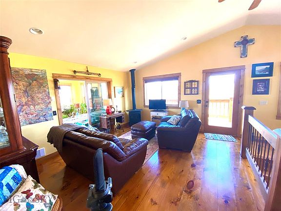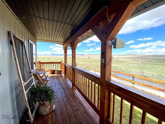 Don't miss out on this find! Big Sky Country postcard views plus a creek which runs through this incredible property. There is no way to exaggerate about the vistas from the gorgeous deck of this tasteful home! A remarkable and rare acreage includes this beautiful home with many custom features, including gorgeous wood deck on two sides that invites you right outside to take in this captivating place. An open kitchen with beautiful cabinetry, tile floors that extend into the dining area. The living room, hallway and bedroom feature wide plank wood floors. Living room has a gas stove. Off the living room opens up into a sun room with stunning views and large windows on three sides. Main level has 3 bedrooms and 2 full baths. Downstairs features a walk out basement with a cozy wood stove, full bath, laundry area and extra room for an additional bedroom, office, crafts area or game room. This property also features a greenhouse, corrals, cross and perimeter fencing and 2 car garage.