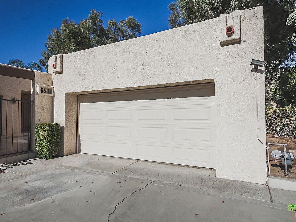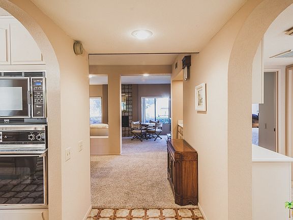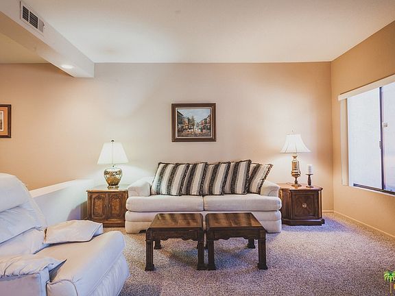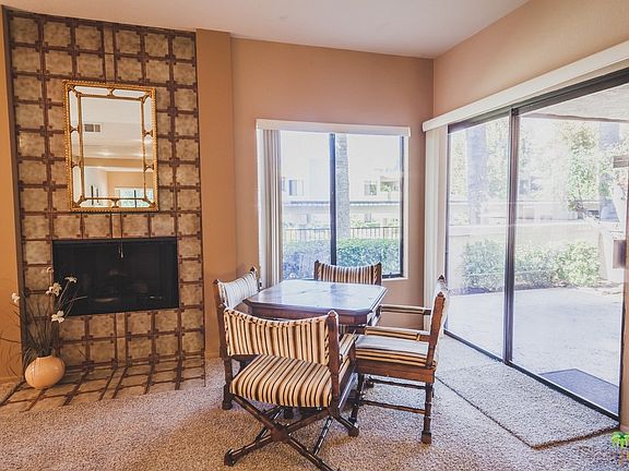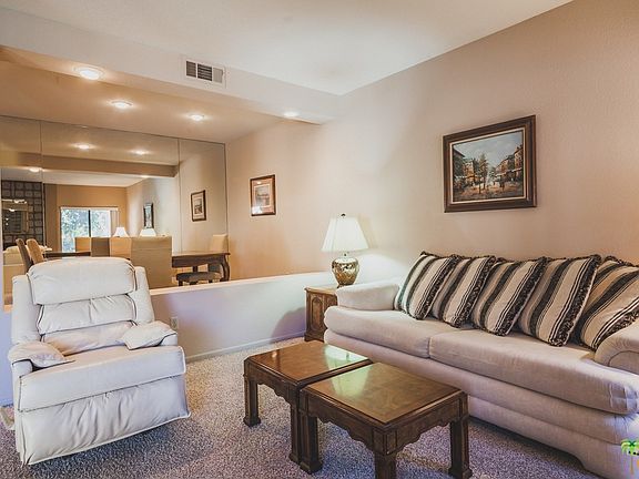 One story 1618 sq. ft. furnished unit at the popular, gated St. Tropez condominiums. 2 bedrooms, 2 baths, and the big plus is the double garage. Formal dining room and breakfast eating area in the kitchen. Fireplace in the living room and interior laundry area. Patio looks out to the swimming pool and mountain views. Complex has two tennis courts and four pool and spas. Ditch the car and walk to the Spa Casino and downtown restaurants and entertainment just blocks away. Furnished unit and an inventory is available. HOA dues include trash & roofs, pets OK. Rental minimum is 30 days. Each unit is individually water metered. Contact listing agent regarding land lease extension.