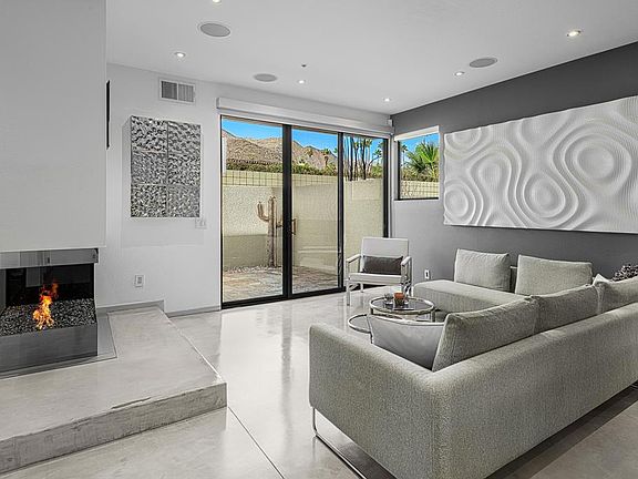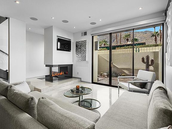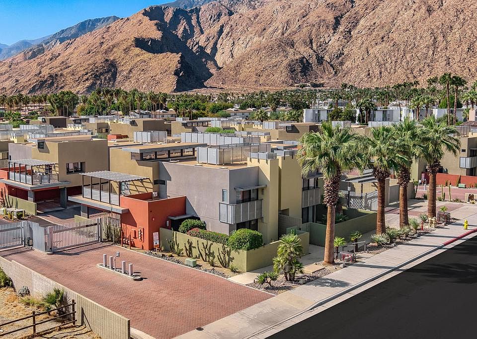 Welcome to designer-inspired townhouse-style living in the modern, gated community of 48@Arenas. This chic 2-bedroom, 2.5-bathroom condo spans 1,596 square feet and offers a perfect blend of urban aesthetic and desert tranquility. Located just a short stroll from the vibrant heart of Downtown Palm Springs, you'll have easy access to dining, retail, the Arenas District, Agua Caliente Casino, and the new Spa and Museum.Step inside to discover a splendid interior design featuring a spacious layout with high ceilings, polished concrete floors, a stylish fireplace, and an open-concept living, dining, and kitchen area. The private patio provides an ideal setting for entertaining or enjoying a quiet moment outdoors. The modern kitchen boasts granite counters and stainless steel appliances, complemented by a convenient stackable in-unit washer/dryer.Upstairs, you'll find two expansive primary suites, each with cork flooring, an abundant closet space, and its own en-suite bath. The primary bedroom features sliders and wrap-around windows that open to a balcony with incredible mountain views.This unit includes a dedicated covered parking space, and the community offers four pools and spas for your enjoyment. With fee-simple land and no lease payment, HOA dues cover earthquake insurance, water, and trash. Furnishings available outside of escrow.