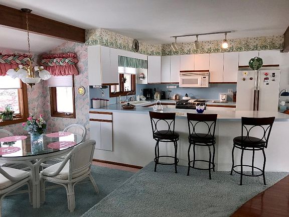 Beautiful ranch with a PRISTINE, spacious, and open interior, vaulted and beamed ceilings, Marvin windows, breakfast bar, bowed window in the dining room, bath and a half, first floor laundry, large master bedroom with one of two access points to a large rear deck, attached garage with a storage room behind, which would make an excellent workshop or craft room, rear shed, .8 acre lot in the country.