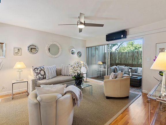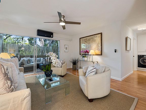 Luxe Efficiency in Bucolic Moraga. Just updated from floor to overhead fixtures and in between, this one-bedroom, one-bath condo contains multitudes. Contemporary flair stylistically unites bathroom and quartz-clad kitchen; living-dining expanse opens broadly to tranquil terrace. Endowed with utility and livability, it incorporates an in-unit washer/dryer combo, plentiful storage, and state of the art, high efficiency cooling and heating mini-split units. Outdoor enjoyment extends as the tree-fringed 36-unit complex enwraps a courtyard-adjacent pool and grants a world of walkability to the Village and recreational open spaces.