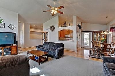 Price reduced 10K! Beautifully maintained semi-custom Ranch in Clover Meadows! You'll love the open floor plan with natural sunlight in the great room & dining room. New hardwood flooring extends from the entry way into the dining room, kitchen & hallway, new carpet on the main level, kitchen is open to the great room w/ 42in. cabinets, hardwood floors & all appliances included. Full hall bath + 2 bedrooms, large master bedroom offers a walk-in closet, large bath w/ jetted tub, shower w/ tile surround. Enjoy the summer evenings on the spacious covered back patio right off the dining room, large landscaped backyard w/ concrete walkways down both sides of the house & large utility shed. Basement w/ full bath is wide open ready for your finishing touch! Close to Rec. Center, hwy. access & more! Bring your RV or boat-plenty of room to park on the extended concrete slab on the side of the house. Original homeowner-this home is ready to move right in. Seller says, "bring us your best offer"!